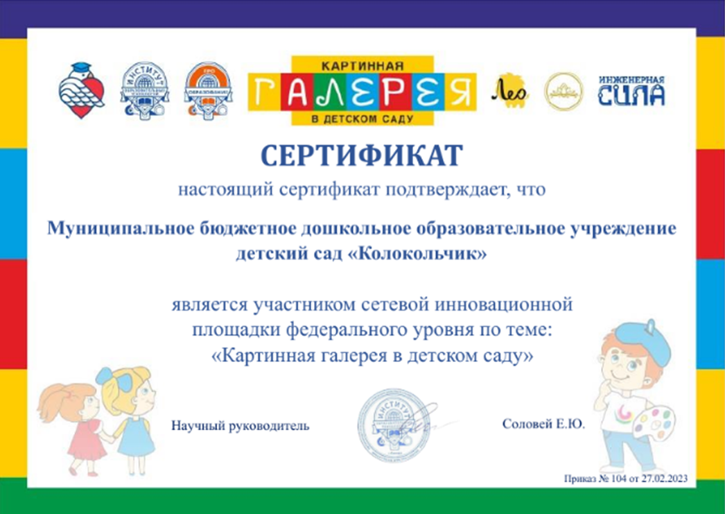 ПРИКАЗ № 104 от 27 февраля 2023 года "О присвоении дошкольным образовательным организациям статуса инновационной площадки федерального уровня АНО ДПО «НИИ дошкольного образования «Воспитатели России» - ознакомиться